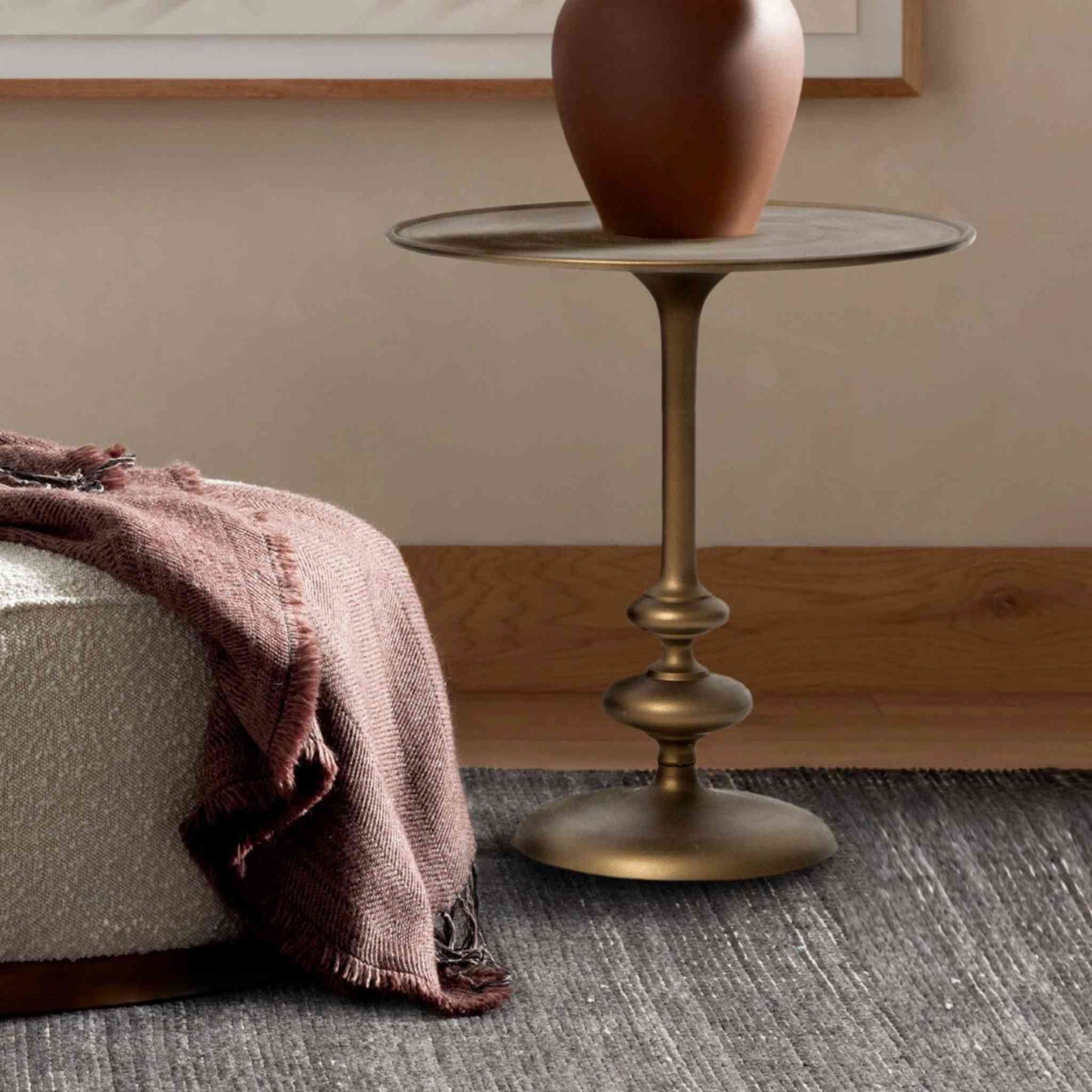 An elegant accent. Textural cast aluminum adds movement to the pedestal table. Sized to nestle beside a sofa or between two chairs.