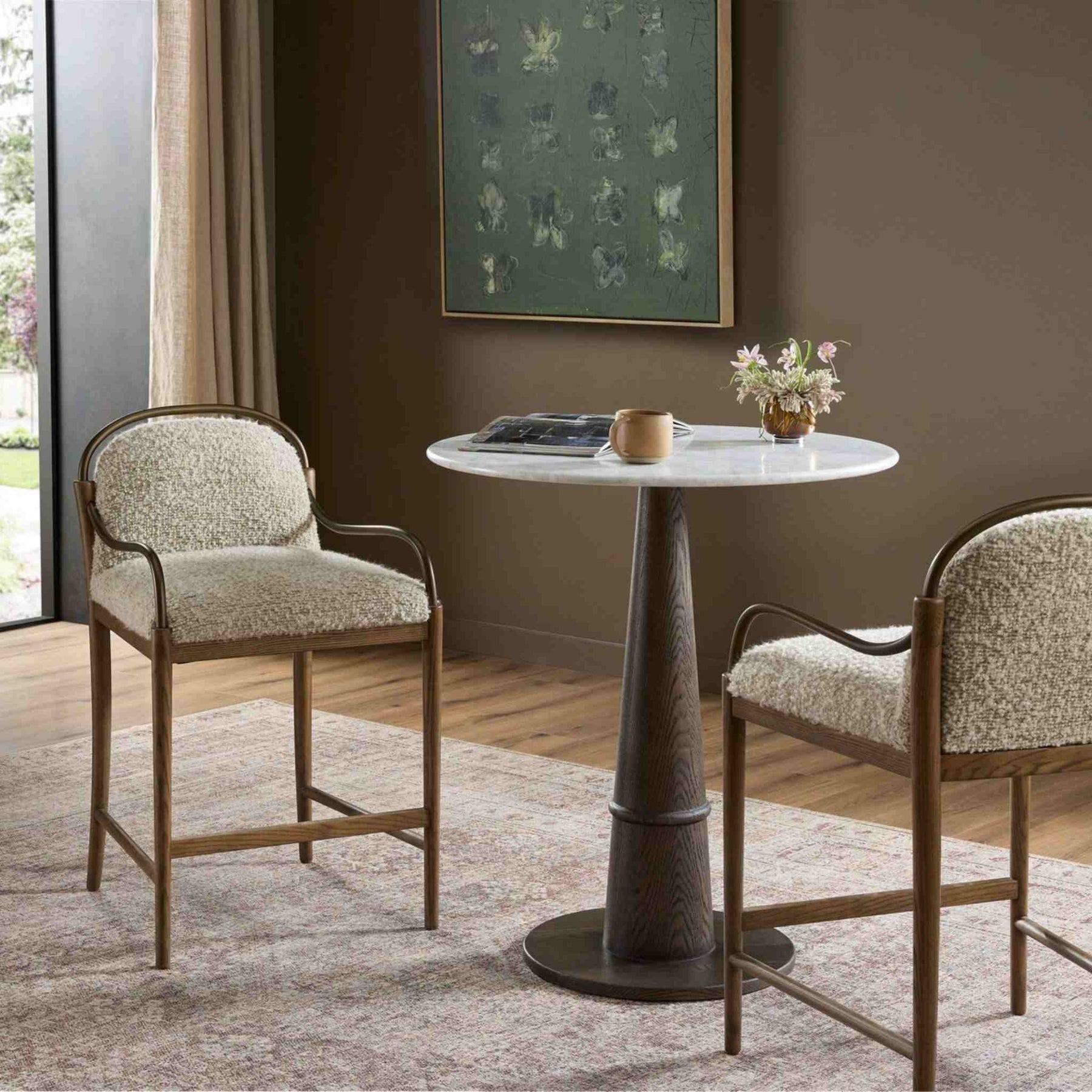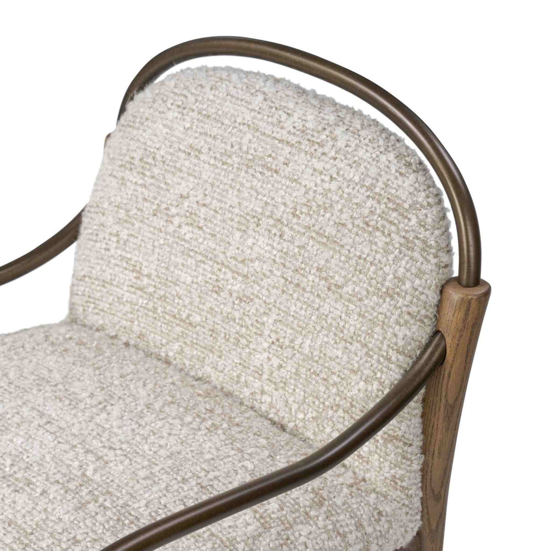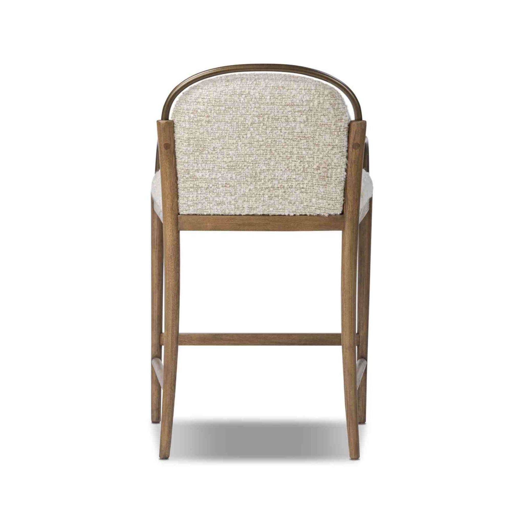 A tribute to traditional artistry and found pieces, this counter stool fluidly combines ash and burnished brass to frame a comfortable S-spring seat. Finished in heavy boucle-like upholstery that features a subtle linear pattern for added depth, creating a luxe, inviting feel. A design collaboration with Amber Lewis.