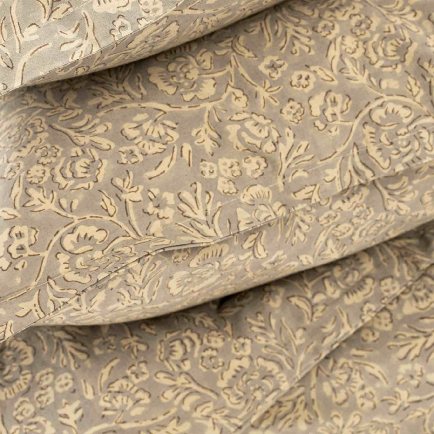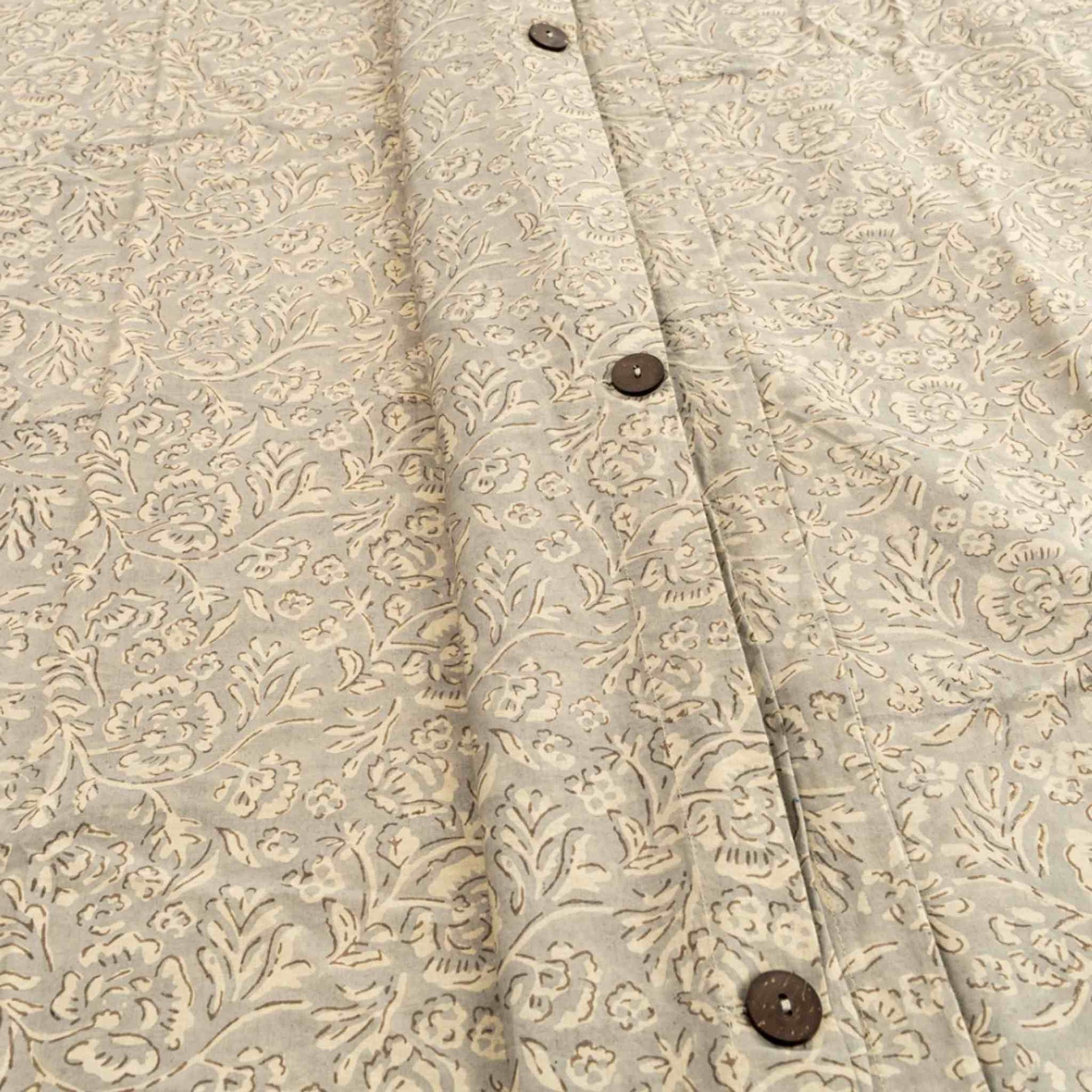 Designed for spacious beds, this set features a soft blue-grey background accented by a warm cream and brown botanical pattern. The hand-block printed design, crafted using traditional techniques, offers a unique blend of artisan craftsmanship and understated sophistication. Completed with eco-friendly coconut shell buttons, this duvet set is as functional as it is beautiful.