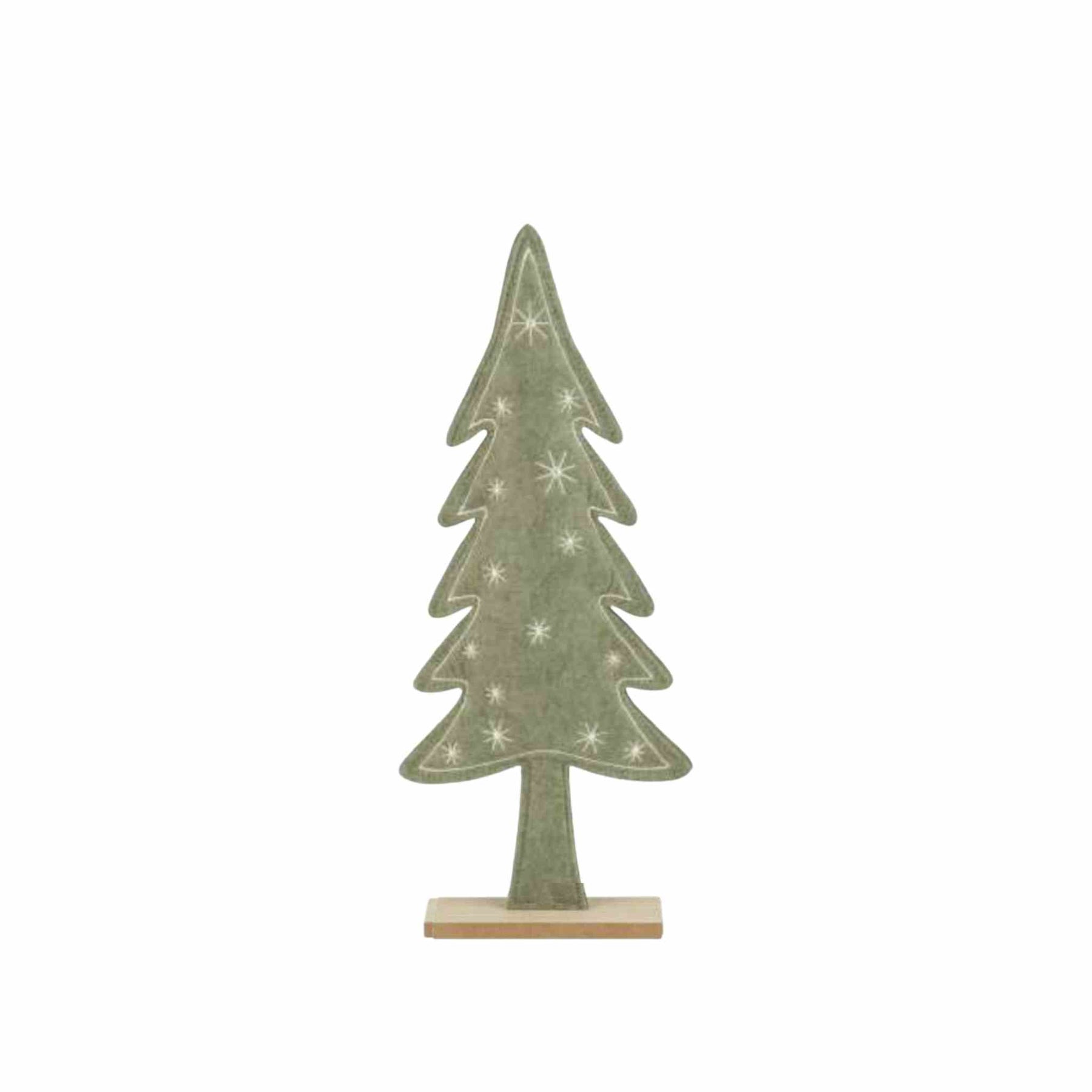 Available in two sizes, each tree stands proudly on its own sturdy wooden platform. Adorned with charming embroidered snowflake details, these whimsical decorations capture the magic of winter with a playful twist. Perfect for shelves, or holiday displays, they add cozy seasonal spirit without fuss.