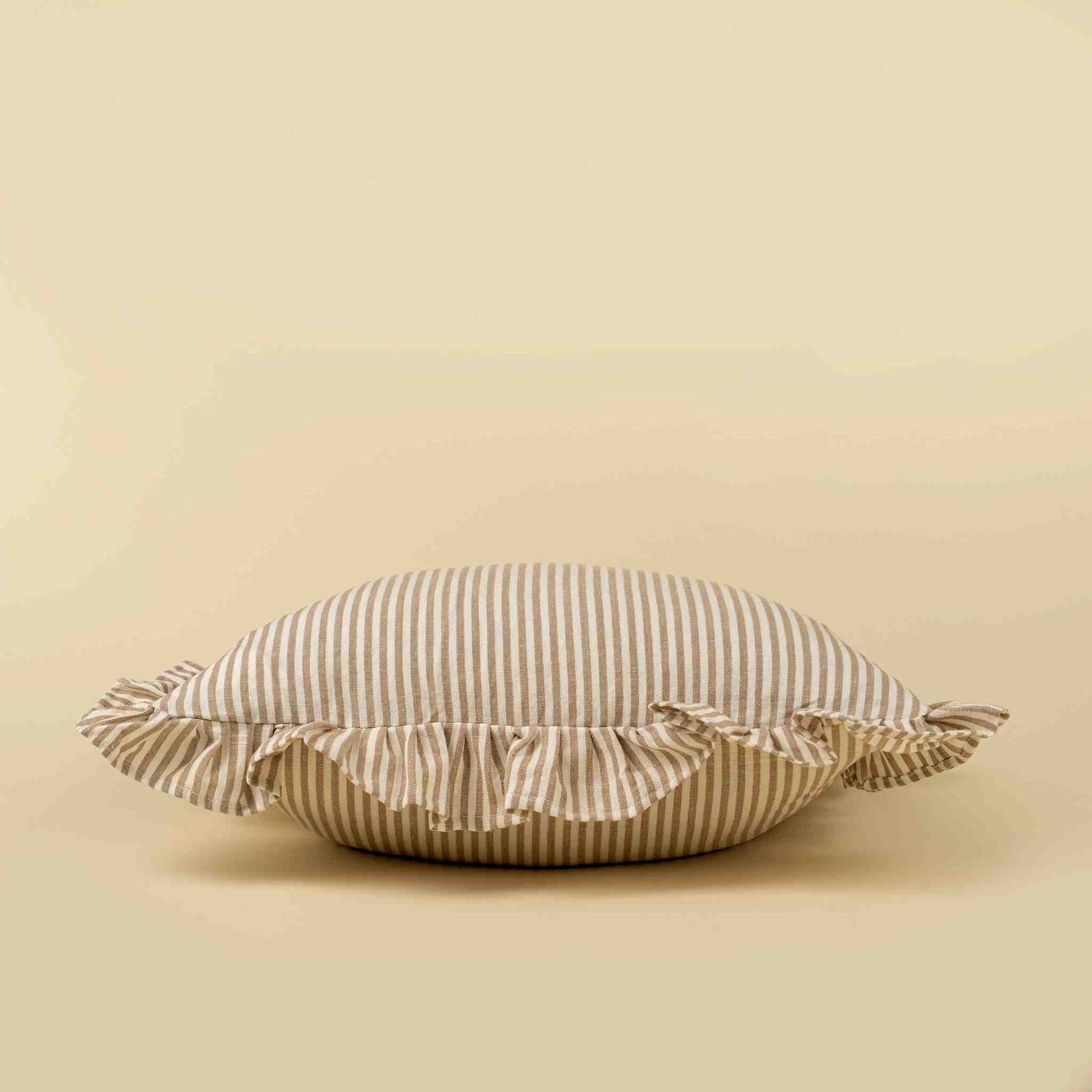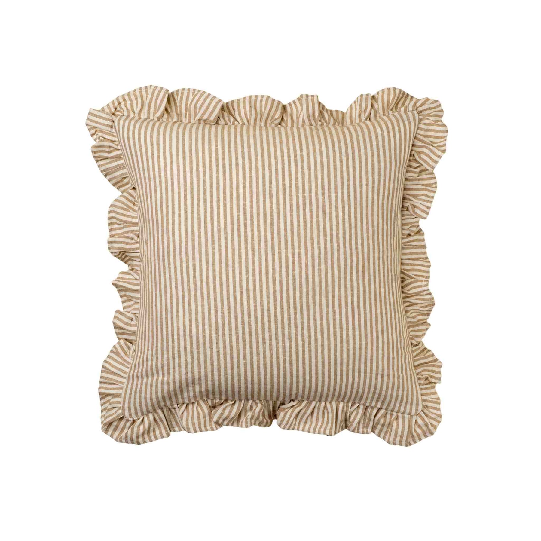 A French cottage sofa pillow with everyday charm. Add light and texture to your home with this handmade pillow. Made from a 50% linen, 50% cotton blend, this throw pillow pairs classic thin stripes with a soft ruffle border for a timeless French cottage feel.
