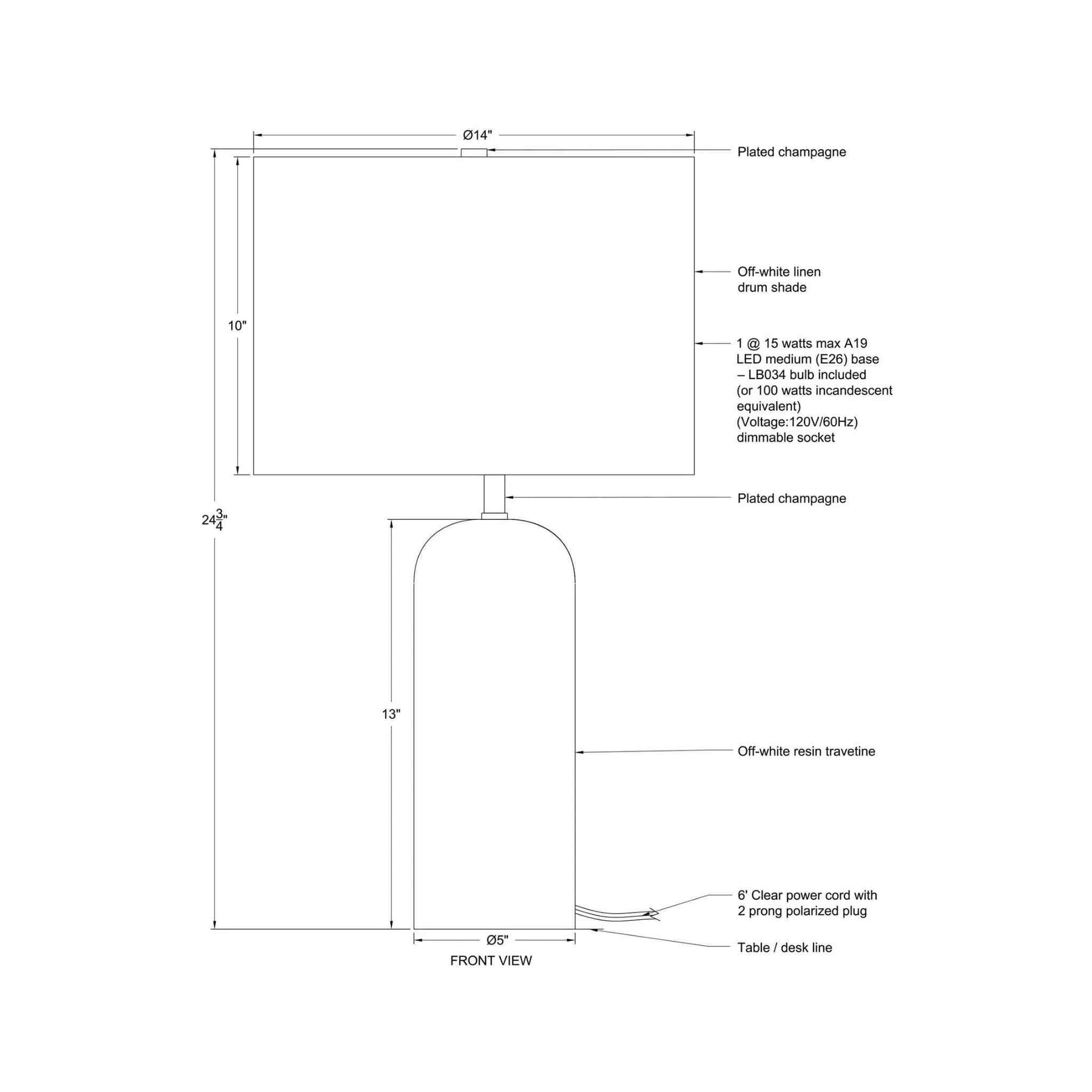 Material: Resin, travertine off-white finish, off-white linen shade, dimmer socket