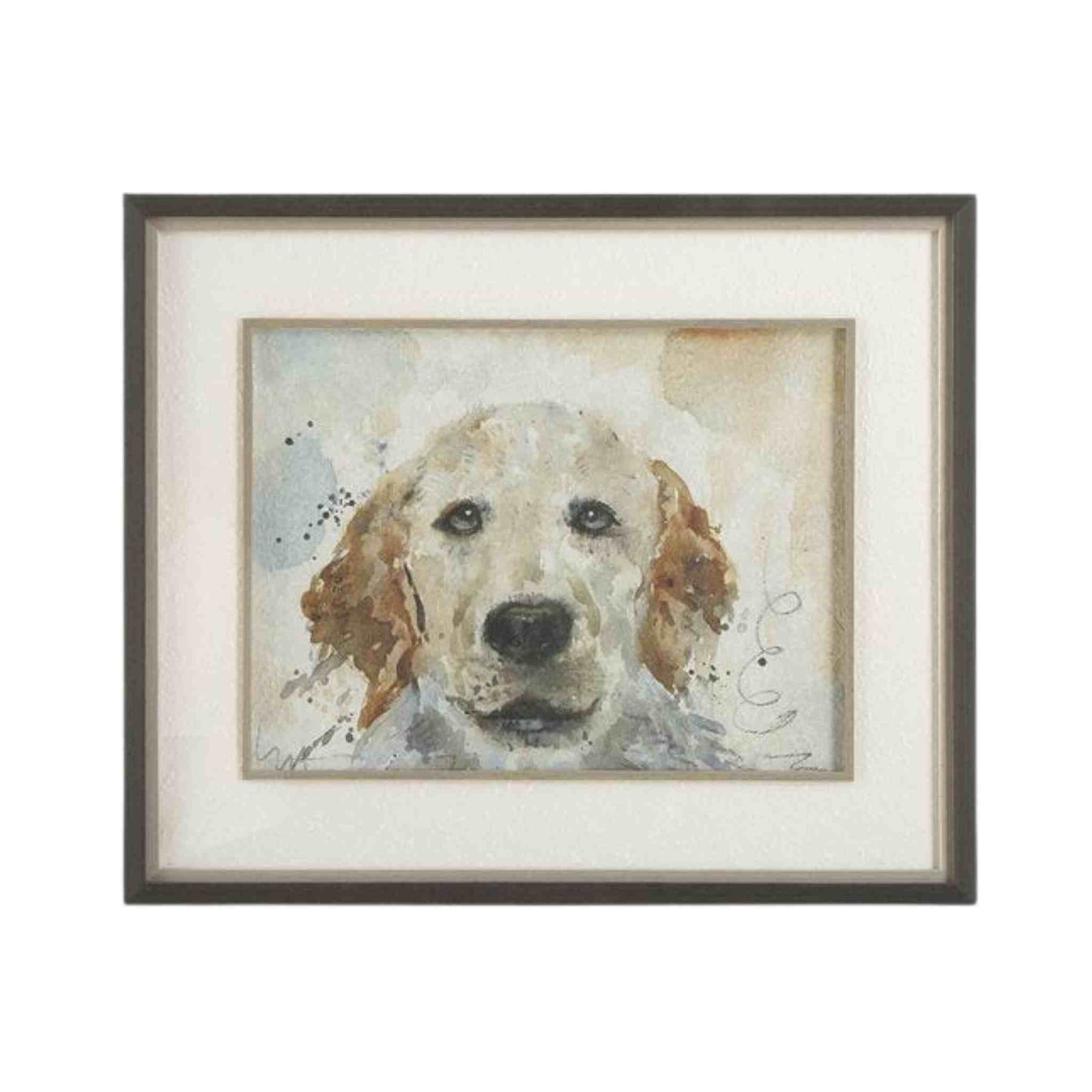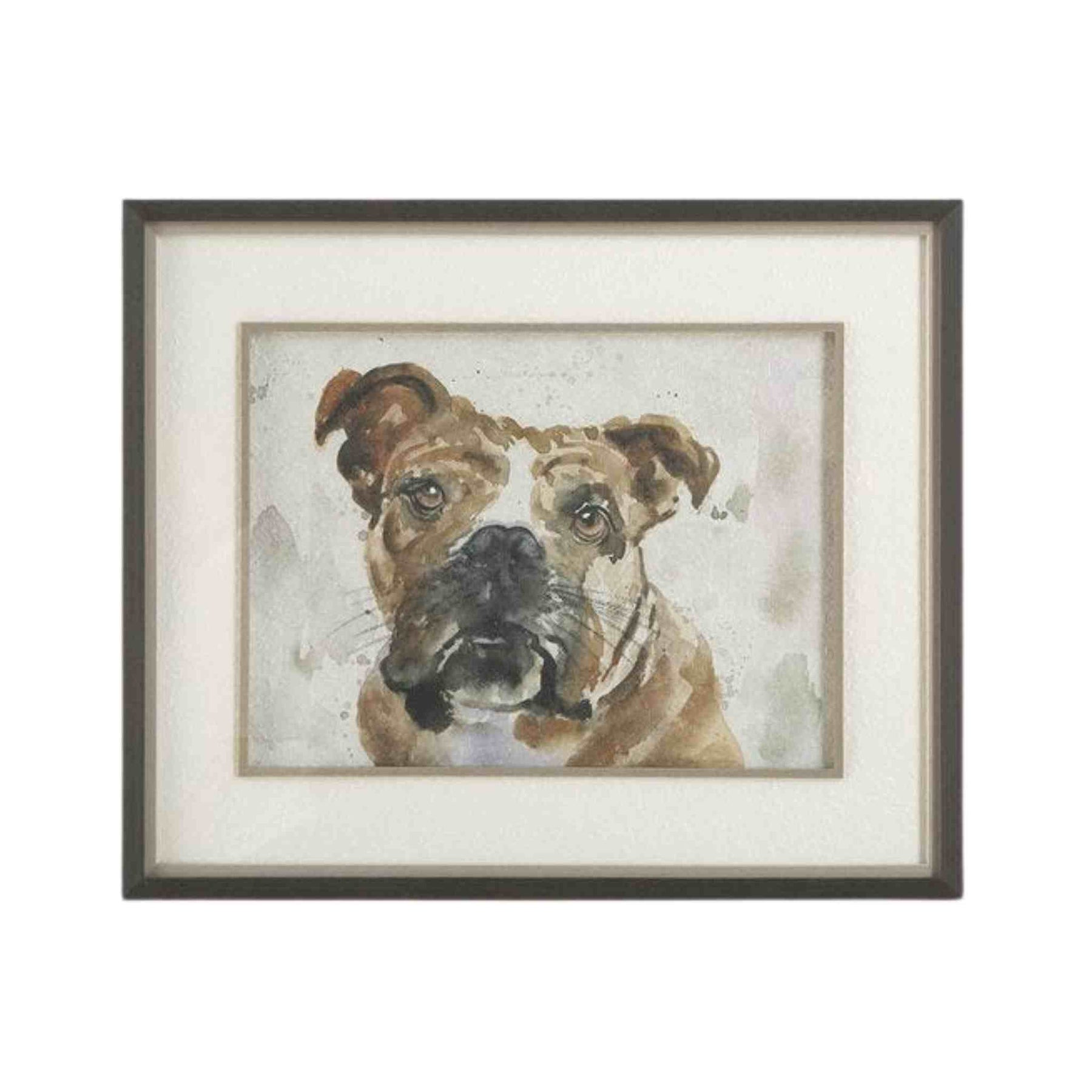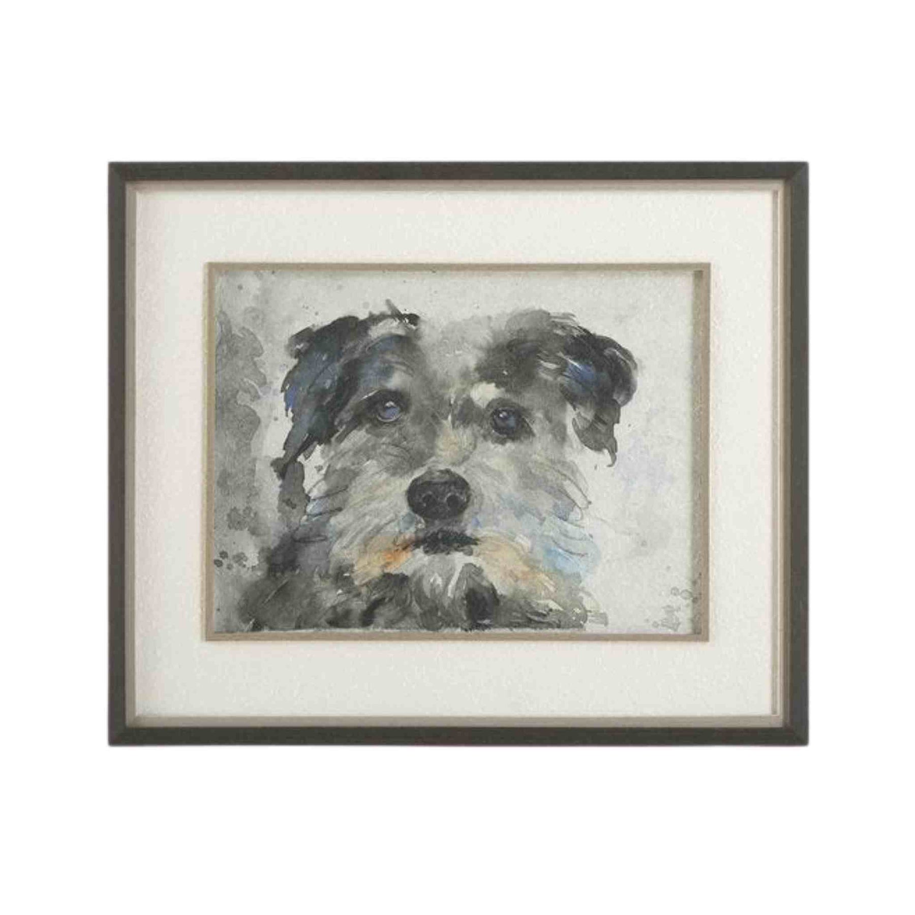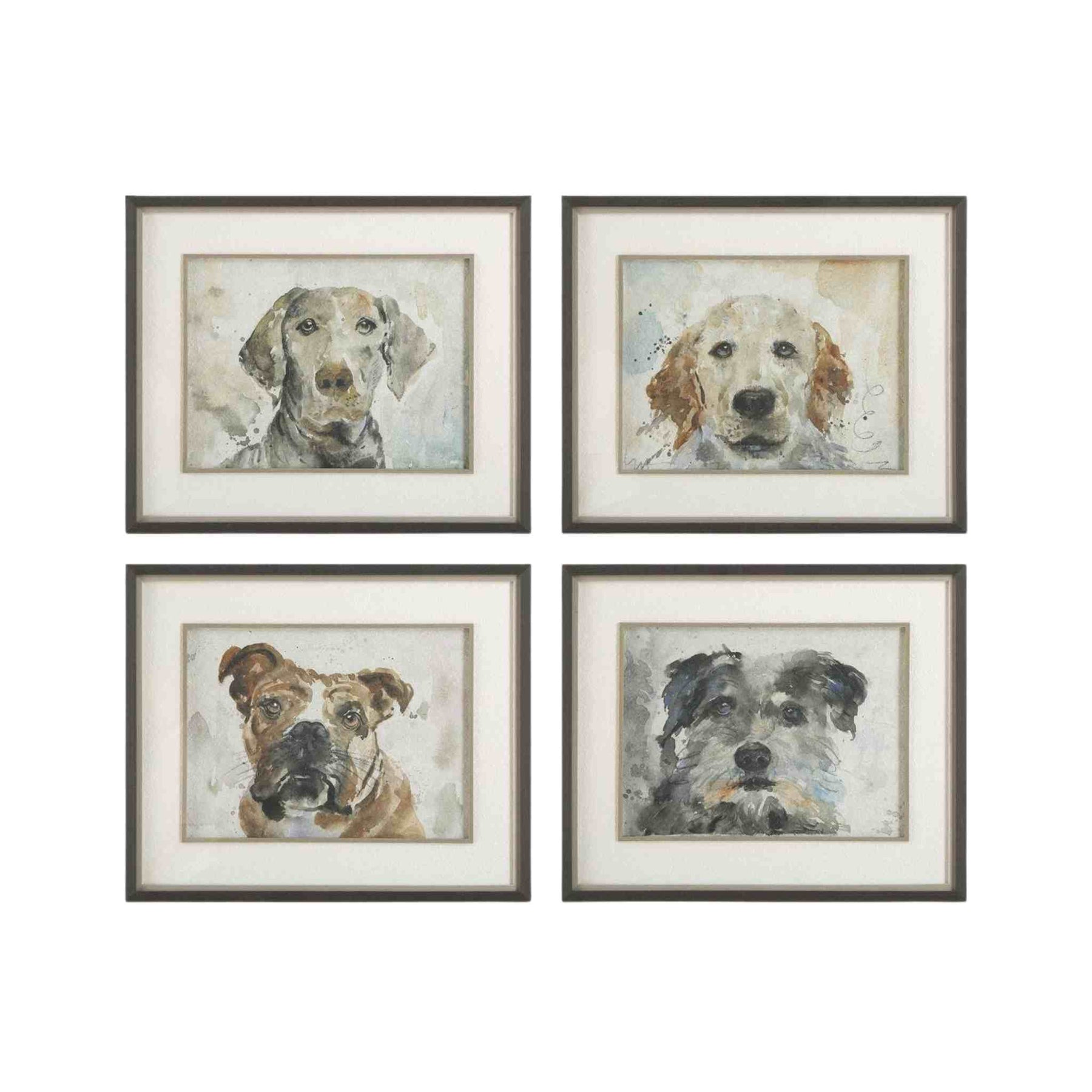 Each frame features an expressive canine portrait, brought to life with soft watercolor brushstrokes. Framed to perfection, each print is comprised of a textured white paper mat, enhanced by a subtle gray liner and fillet, all encased in a sleek, simple black frame. Each print is placed under protective glass.