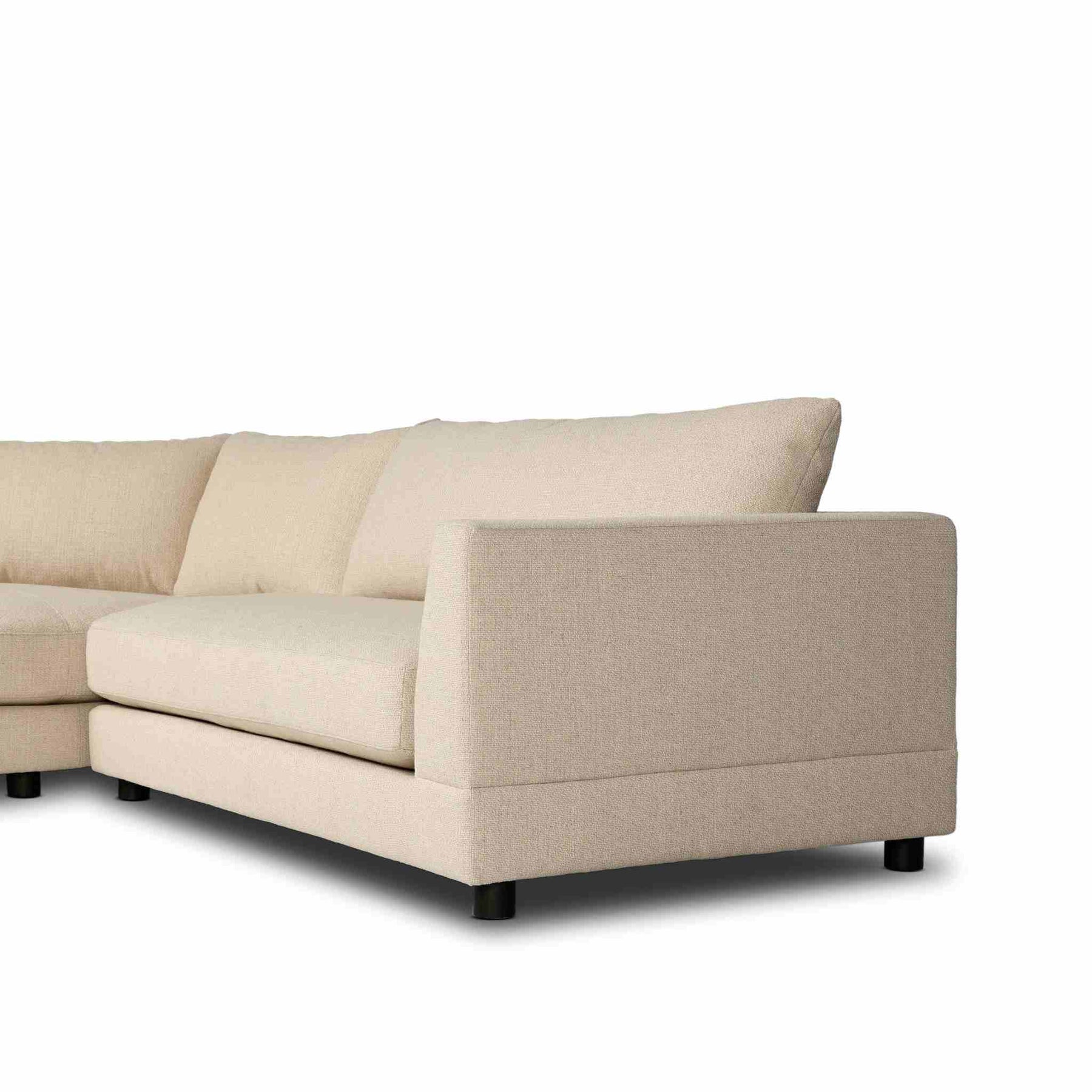 Clean lines meet comfort in this modern-minded sectional. Wrapped in high-performance fabric, an oversized design makes a bold statement while maintaining a tailored look. A rounded chaise adds intriguing shape, while webbed suspension and foam, fiber and feather invite relaxation.