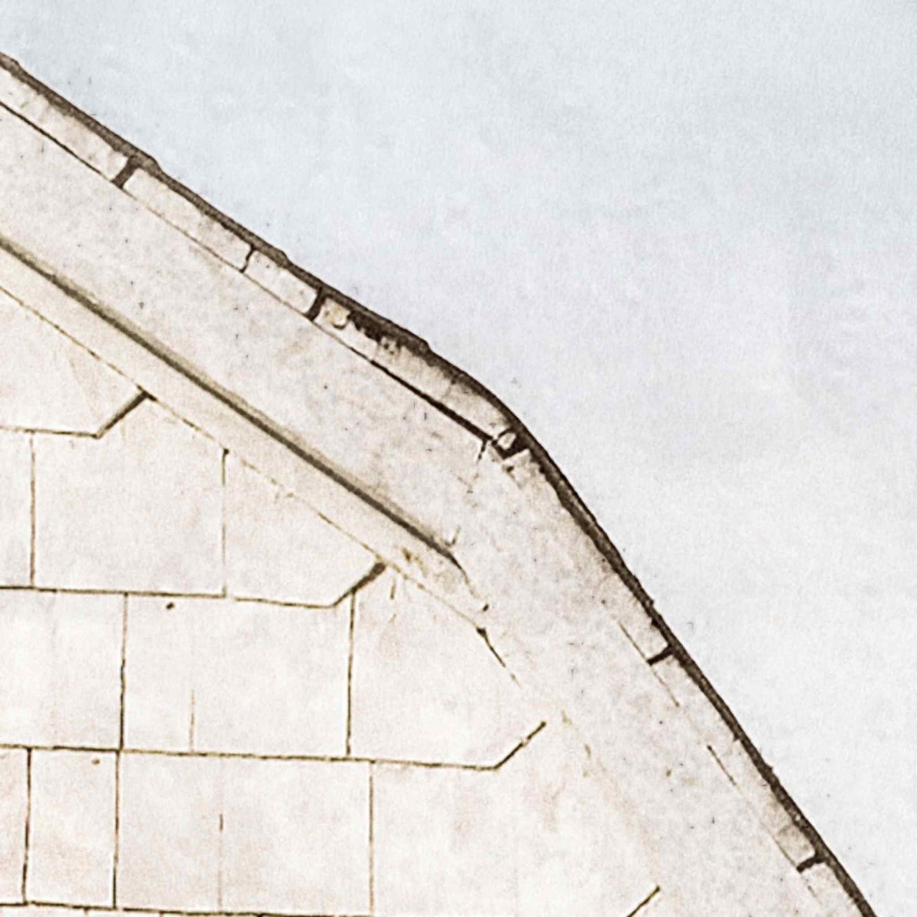 This weathered photograph features a quaint, charming farmhouse in tones of blue, cream, and muted browns. The creased paper texture and soft colours add a surreal, dream-like quality. Also comes in Small (24.5"W x 17.5"H) and Large (53.5"W x 37.5"H).