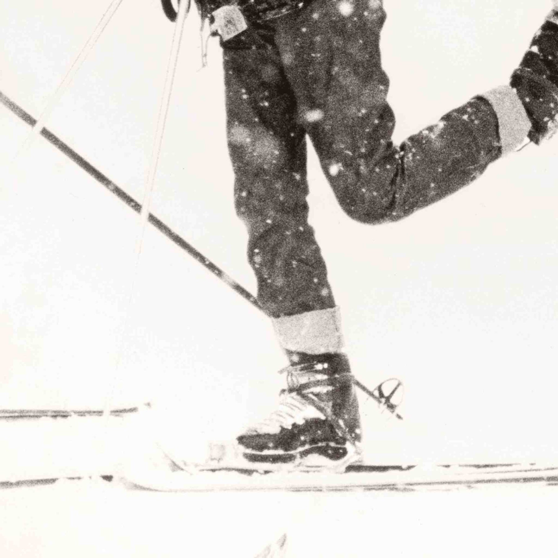 Taken in 1966, this remarkable collection of vintage photographs showcases groups of skiers partaking in a relaxed winter pastime during the mid-20th century. This vintage photograph captures a woman laughing with a friend, as she has her skis waxed amidst the gentle snowfall covering her and other skiers on the slopes.