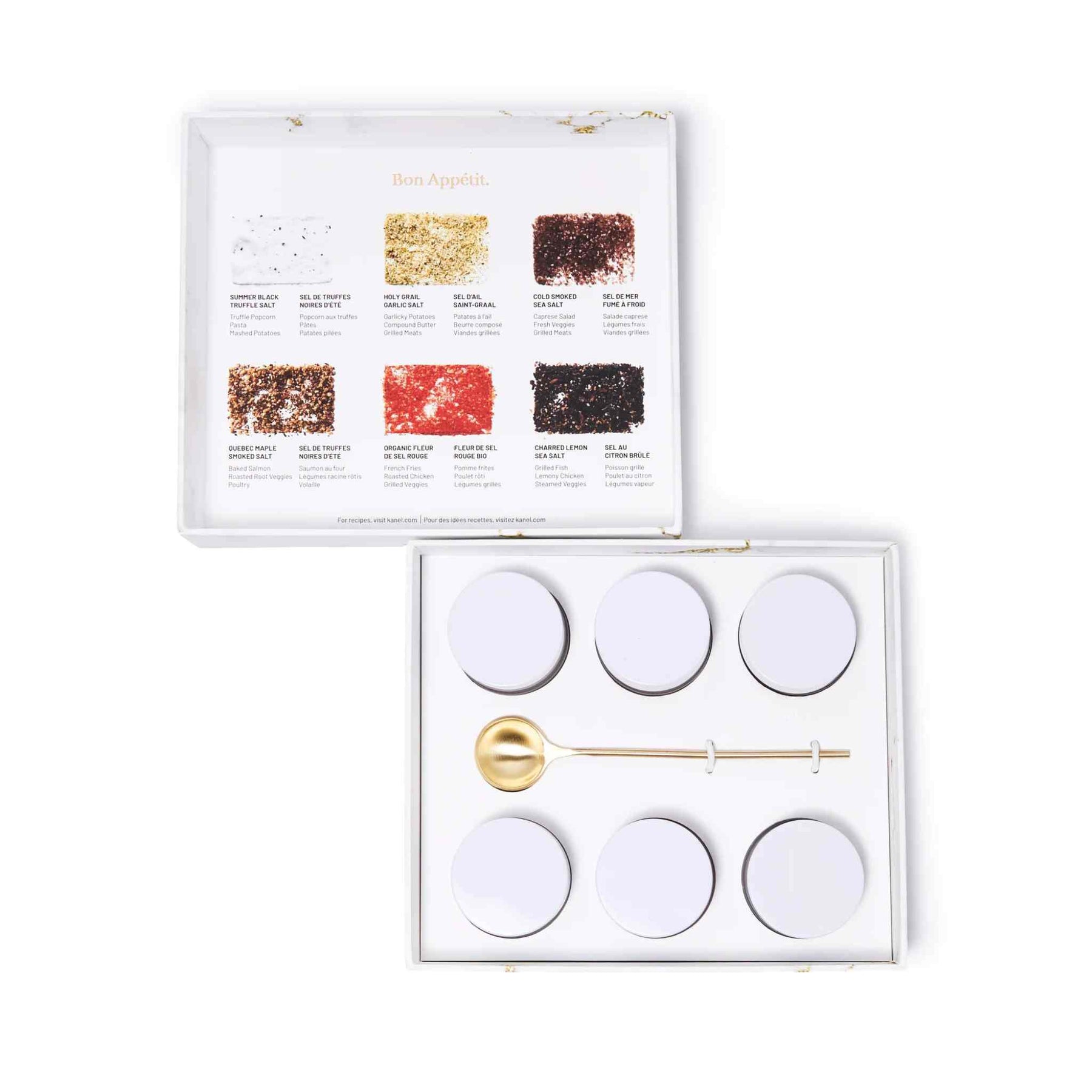Includes: Summer Black Truffle Salt, Holy Grail garlic Salt, Charred Lemon Sea Salt, Quebec Maple Smoked Salt, Organic Fleur de Sel Rouge, Cold Smoked Sea Salt, Solid Brass Seasoning Spoon